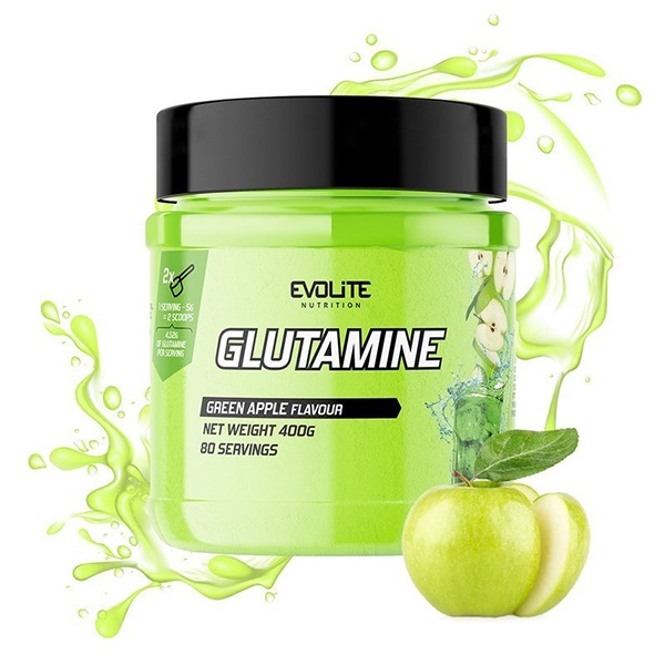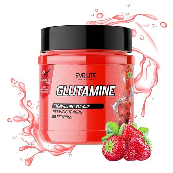 Evolite Glutamine 400g - opakowanie wersji bezsmakowejEvolite Glutamine - opakowanie 400g truskawkaEvolite Glutamine - opakowanie l-glutaminy jabłkowej 400g