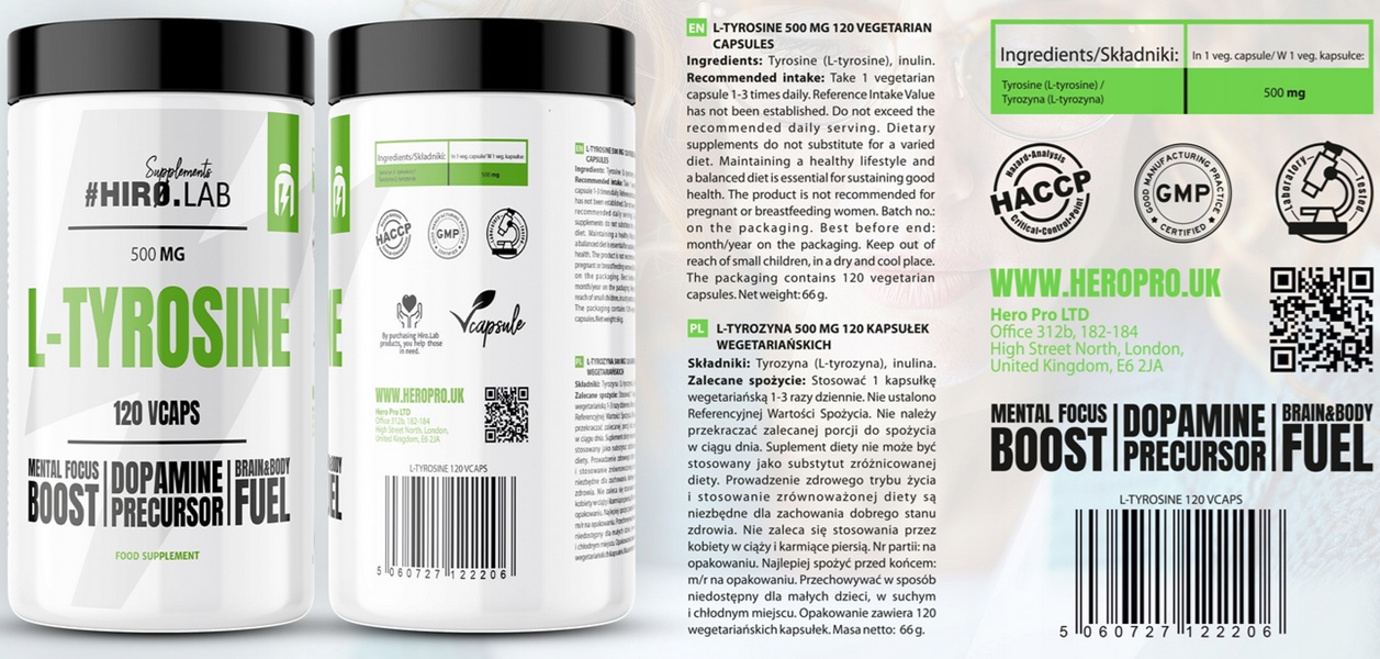 HIRO.LAB L-Tyrosine to produkt stworzony z myślą o osobach, które potrzebują wsparcia w utrzymaniu energii, koncentracji oraz lepszej wydajności w codziennym życiu, intensywnych treningach i w walce z nadmiernym stresem. L-tyrozyna, wpływa pozytywnie na funkcje poznawcze, energię fizyczną i psychiczną, a także wspomaga procesy spalania tkanki tłuszczowej, co czyni ją idealnym wyborem dla osób dążących do utraty wagi.