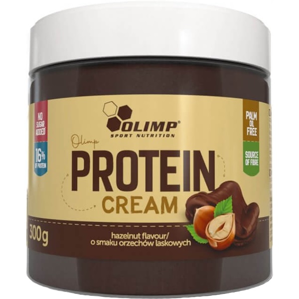 Olimp Protein Cream jest połączeniem orzechów laskowych, białka serwatkowego, masła shea i kakao w postaci przepysznego i zdrowego kremu o znikomej zawartości cukrów. Olimp Protein Cream nie zawiera dodatku oleju palmowego i innych niezdrowych, sztucznych dodatków, a słodzony jest naturalnym malitolem. Może być zdrowym dodatkiem do fit przepisów, przekąsek, deserów, naleśników i pieczywa. Olimp Protein Cream zawiera dodatek najwyższej jakości WPC - koncentratu białka serwatkowego. Białko tego typu charakteryzuje się wysoką wartością biologiczną i rewelacyjnym składem aminokwasowym. Pojedyncza porcja - łyżeczka kremu nie dostarczy nawet grama cukrów, typowe węglowodany zostały zastąpione przez poliole, dzięki czemu produkt może być stosowany również przez cukrzyków.