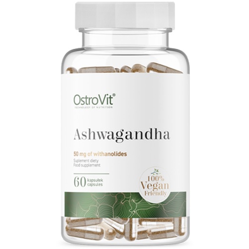 OstroVit Ashwagandha VEGE to wyjątkowo silna dawka ashwagandhy, która dostarcza aż 50 mg witanolidów w kapsułce zawierającej 700 mg ekstraktu. Zarówno ekstrakt jak i sama otoczka kapsułki nie zawierają substancji pochodzenia zwierzęcego, więc produkt jest przyjazny dla wegetarian i wegan. Ashwagandha czyli Witania ospała to od wieków ceniona roślina, będąca obecnie bardzo polecanym adaptogenem, w szczególności radząca sobie świetnie z podwyższonym poziomem hormonu stresu - kortyzolu. Ashwagandha poprzez pozytywny wpływ na układ nerwowy nie tylko poprawia samopoczucie, ale również podnosi odporność fizyczną, psychiczną, skupienie, koncentrację. Produkt jest bezkonkurencyjny jeśli chodzi o jakość, siłę i stężenie ekstraktu, a do tego jest wyjątkowo atrakcyjny cenowo.