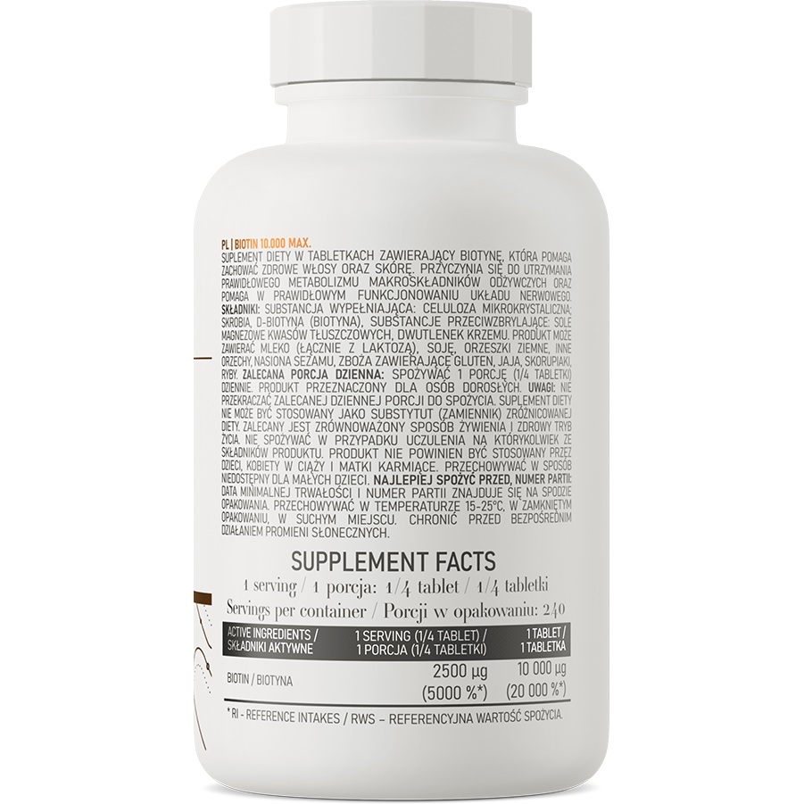 OstroVit Biotin - Biotyna 10.000 MAX 60 tabletek - zawiera bardzo wysoką dawkę składnika aktywnego w postaci dobrze przyswajalnej D-biotyny.