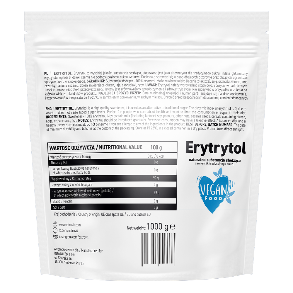 OstroVit Erytrytol 1000g - wysokiej jakości erytrytol - produkt słodzący, będący jednocześnie zdrowszą alternatywą dla cukru. OstroVit Erytrytol jest produktem o indeksie glikemicznym równym zeru, nie podnosi poziomu glukozy we krwi, pozytywnie wpływa na stabilny poziom insuliny w organizmie (nie stymuluje gwałtownego wydzielania insuliny, a następnie szybkiego spadku). Erytrytol nie jest metabolizowany przez ludzki organizm i praktycznie całościowo jest wydalany wraz z moczem. Produkt jest idealny do stosowania w diecie redukcyjnej i dla każdego komu zależy na zdrowej diecie polegającej między innymi na mniejszej podaży cukru.