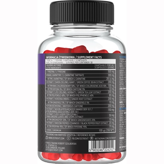 Skład: L-tyrozyna, winian L-karnityny, ekstrakt z ziaren zielonej kawy (Coffea arabica L.) - 50% kwasu chlorogenowego oraz 5% kofeiny, ekstrakt z liści zielonej herbaty (Camellia sinensis (L.) Kuntze) - 40% polifenoli, ekstrakt z korzenia imbiru (Zingiber officinale Rosc.) - 5% gingeroli, kofeina bezwodna, ekstrakt z nasion afrykańskiego mango (Irvingia gabonensis L.) DER 10:1, ekstrakt z liści i łodyg żeń-szenia (Panax ginseng C.A. Mey.) – 20% ginsenozydów, substancja przeciwzbrylająca: dwutlenek krzemu; ekstrakt z owoców czarnego pieprzu (Piper nigrum L.) - 95 % piperyny, otoczka kapsułki (żelatyna, woda, barwniki: dwutlenek tytanu, tlenek żelaza czerwony, czerwień allura AC*, czerwień koszenilowa A*, żółcień chinolinowa*), pikolinian chromu (chrom).