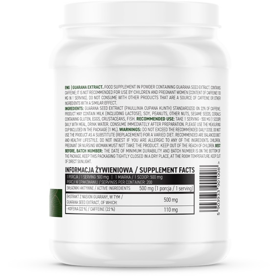 Skład: Ekstrakt z nasion guarany (Paullinia cupana Kunth) standaryzowany na 22% kofeiny.
