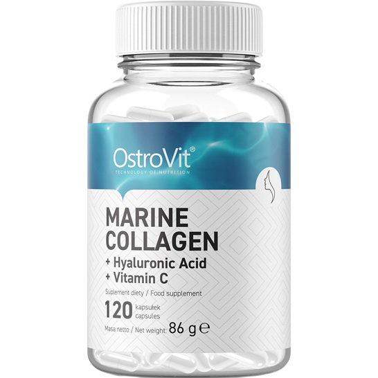 OstroVit Marine Collagen + Hyaluronic Acid + Vitamin C to suplement diety w kapsułkach zawierający najwyższej jakości kolagen morski (rybi) wzbogacony o takie składniki jak kwas hialuronowy oraz witamina C. Takie połączenie składników aktywnych w jednej kapsułce jest polecane dla wszystkich, którzy cenią sobie naturalne piękno i zdrowie swojej skóry, a także dla wszystkich aktywnych fizycznie osób, które uprawiają sport czy np. turystykę górską i ich kości, stawy, ścięgna są narażone na nadmierną eksploatację czy kontuzje. Synergizm działania 3 składników aktywnych OstroVit Marine Collagen pozwala na o wiele sprawniejszą odbudowę poszczególnych tkanek, wzmocnienie tkanek miękkich, lepszą elastyczność, co uodparnia je na uszkodzenia. Lepsza elastyczność skóry przeciwdziała powstawaniu cellulitu, kwas hialuronowy skutecznie przyspiesza gojenie ran, otarć. Witamina C towarzysząca kolagenowi jest niezbędna do prawidłowej jego syntezy i wspiera prawidłowe funkcjonowanie i budowę chrząstki stawowej, dziąseł, skóry czy zębów.