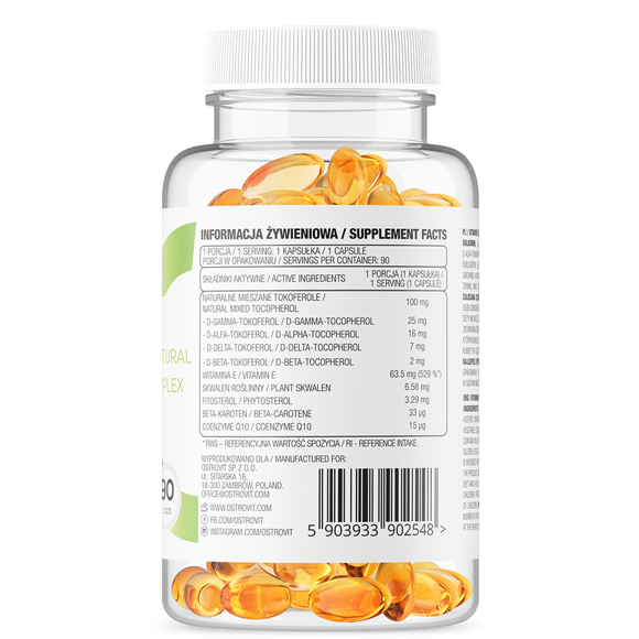WItamina E Naturalny Kompleks Tokoferoli wspiera organizm przez szkodliwym działaniem wolnych rodników, które pojawiają się w żywności oraz środowisku. OstroVit