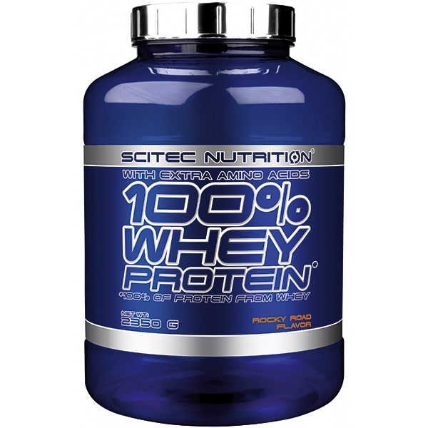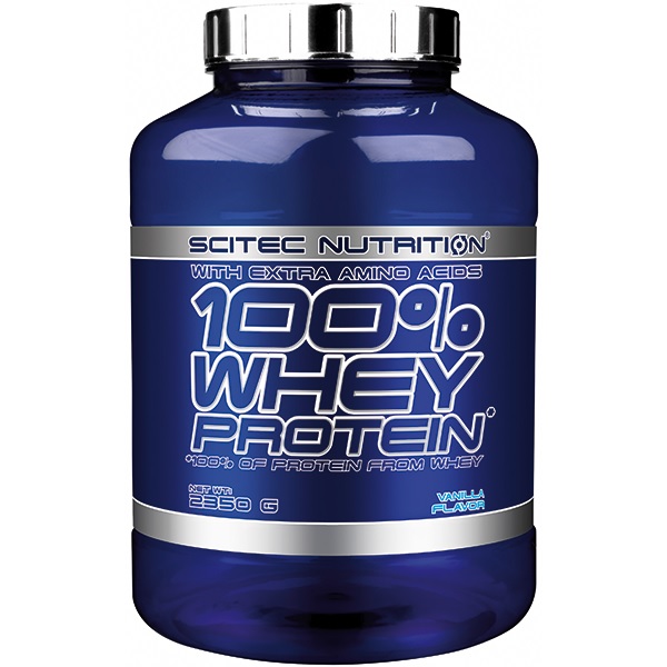Scitec 100% Whey Protein 2350g - wysokiej jakości odżywka proteinowa, oparta na ultrafiltrowanym koncentracie białka serwatkowego z dodatkiem matriksu (1650 mg na porcję) wolnych aminokwasów l-glutaminy, tauryny. Dostępny w dużej ilości wyśmienitych smaków. Zawiera kompletny profil aminokwasowy, w tym wszystkie aminokwasy niezbędne (EAA). Ten produkt może być doskonałym źródłem białka podczas diety rozbudowującej czystą masę mięśniową, lub podbicie protein podczas diety redukcyjnej (odchudzającej). Ultrafiltrowany koncentrat białek serwatkowych jest jednym z najszybciej wchłanialnych (po hydrolizacie oraz ilzolacie serwatki) form białka. Jest białkiem pełnowartościowym o bardzo dużym potencjale anabolicznym i antykatabolicznym. Aż 47,5% puli aminokwasów to aminokwasy tak ważne jak BCAA, arginina, glutamina i tyrozyna! Aminokwasy egzogenne to 50% z całości 100% Whey Protein. Wiele konkurencyjnych produktów ma zdecydowanie mniejszy udział tych aminokwasów, co znacznie obniża walory takiego suplementu.