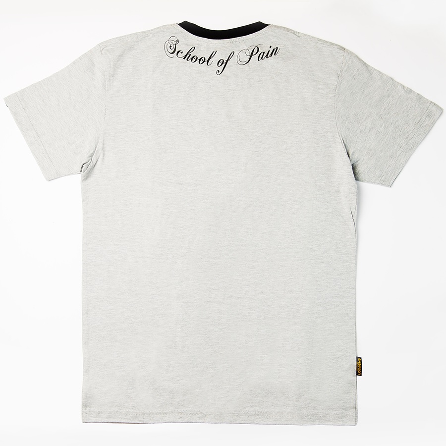 Shatoon T-Shirt Maska School of Pain Grey - koszulka szara "Maska" - wykonana z najwyższej jakości bawełny i uszyta z największą starannością (wyprodukowana w Polsce). T-shirt Maska posiada duży nadruk z przodu i napisy "shatoon" "School of Pain" oraz duży nadruk z podobizną samuraja i 2 mieczami na całej powierzchni pleców. Koszulka jest bardzo wytrzymała, nie jest podatna na zmiany kształtu, mechacenie i rozdarcia. W sam raz na różnego rodzaju treningi jak i codzienną aktywność.